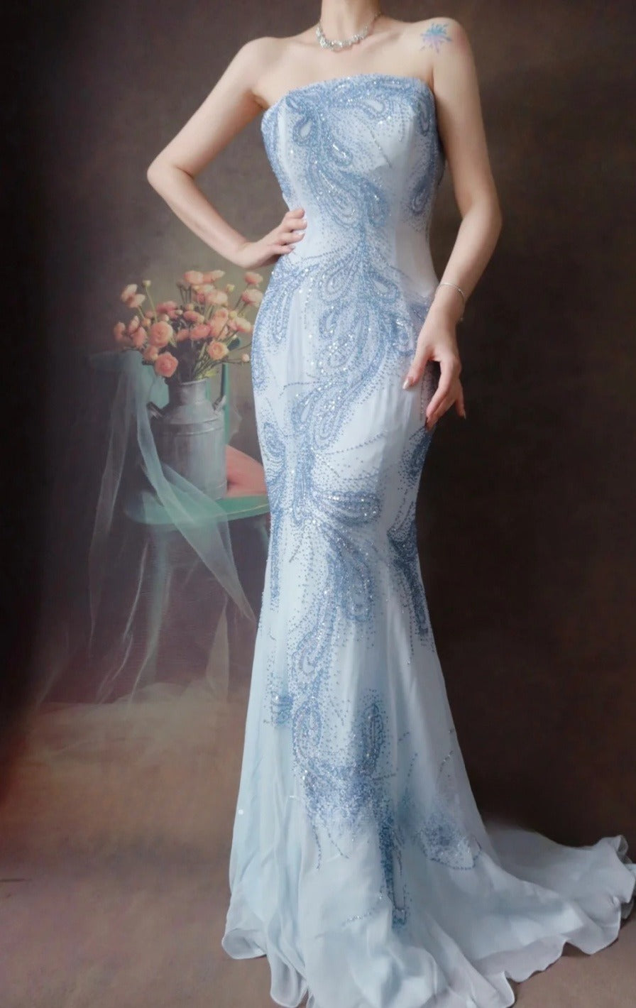 Ndyad Strapless Mermaid Long Prom Dresses Beaded Chiffon Light Gray Blue Evening Dresses HZ1024